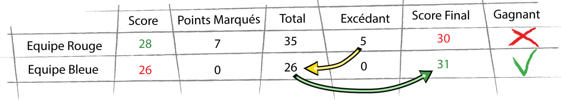 - Il y a donc 5 points en trop qui vont à l'équipe bleue, et l'équipe rouge arrive à 30 points
